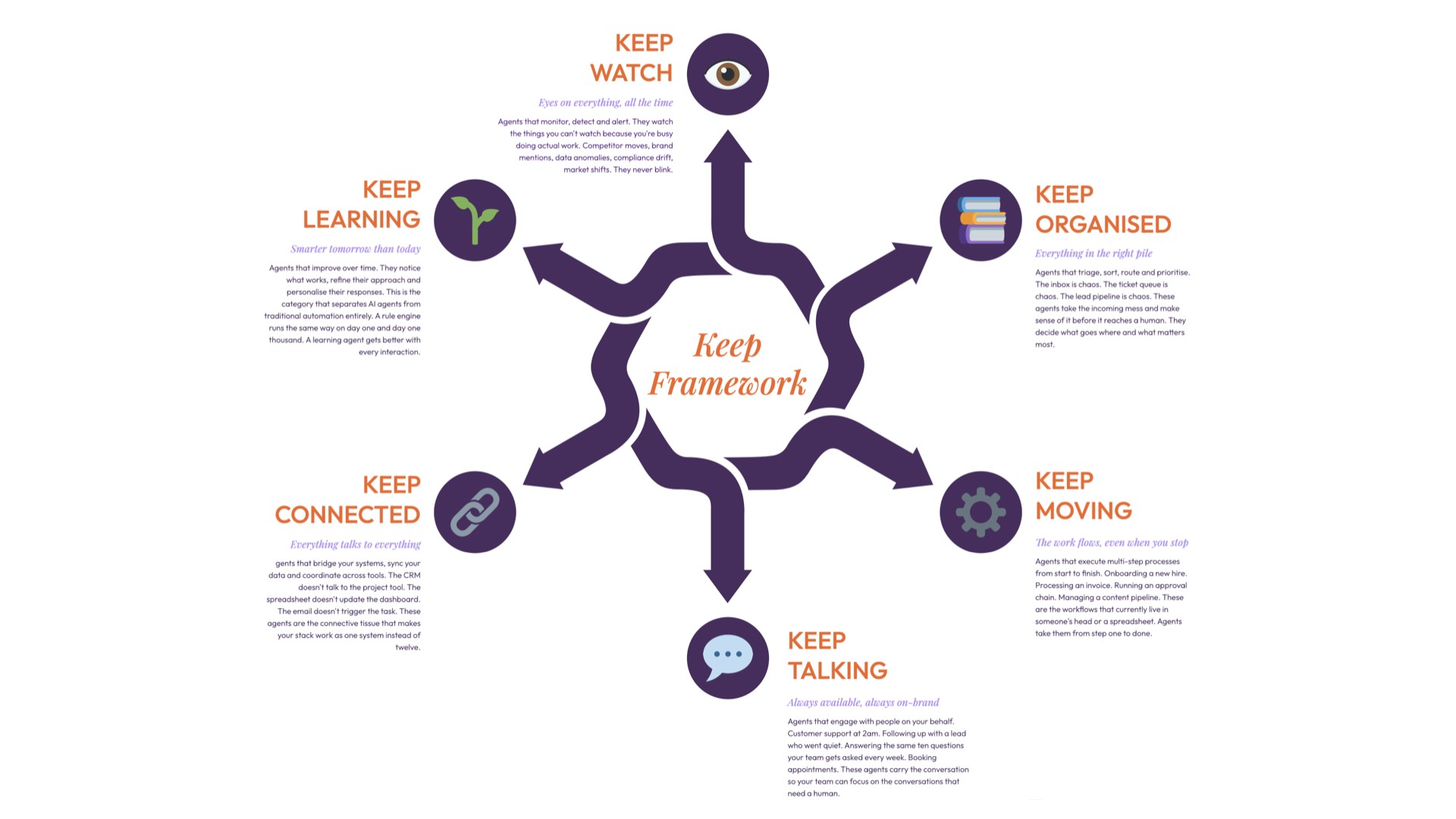 The six "Keeps" describe the things an agent can do for you, not how it's built. Whether you're using Claude Code, a ChatGPT Agent, Gemini Agent, Make or Zapier or whatever emerges next week, next quarter or next year, these categories hold.